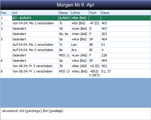 In der DaVinci Look Vertretungsansicht können Sie kompakt die Vertretungslisten für einen bis 6 Tage anzeigen. Die Anzeige aktualisiert sich ständig und daher auf einem Infoterminal im Lehrerzimmer oder Sekretariat ohne Tastatur laufen.