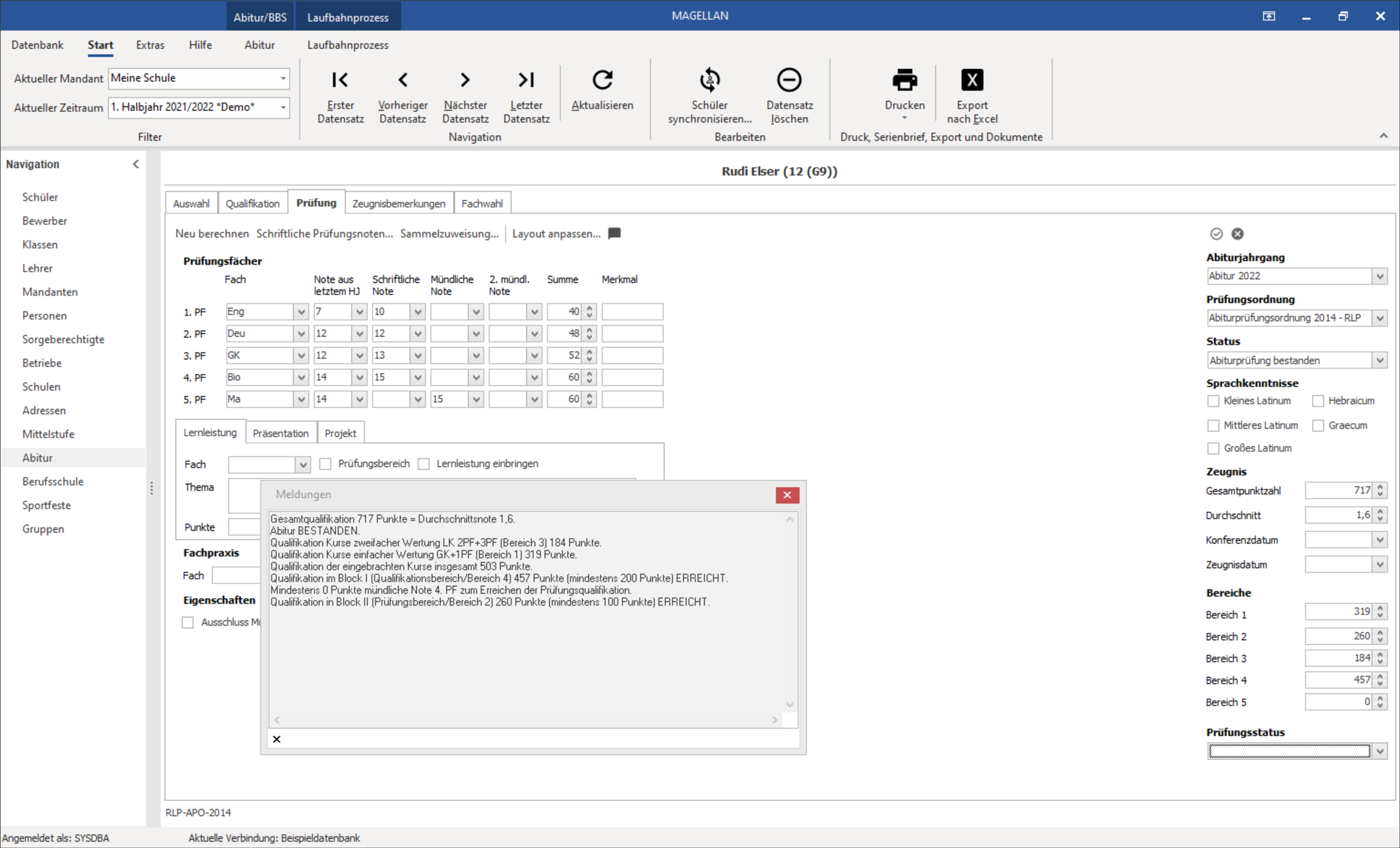 Nachdem der Schüler zur Abiturprüfung zugelassen wurde, können Sie auf der Registerkarte Prüfung die schriftlichen und mündlichen Prüfungen erfassen sowie die zusätzlichen besonderen Lernleistungen, Seminarfächer oder Präsentationdprüfungen. Das Abiturskript Ihres Bundeslandes entscheidet bei der Vorschlagsautomatik, ob es z.B. sinnvoll ist eine besondere Lernleistung einzubringen oder wieviel Punkte mindestens in einer weiteren mündliche Prüfung erreicht werden müssen, um den Abiturschnitt zu verbessern. Zum Abschluss können Sie dann das Abiturzeugnis ausgeben.